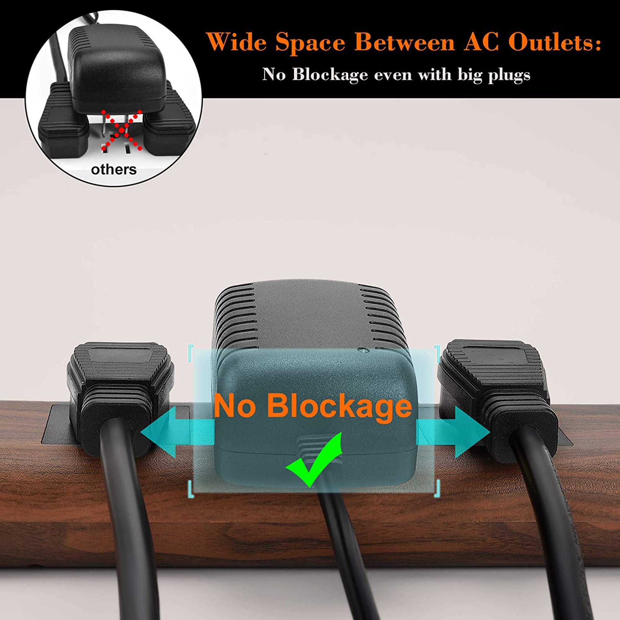• 【No Blocking】: This 3-outlet power strip has wide space between two outlets, and you can even plug non-standard plugs. Besides, this flat plug power strip suits perfectly in tight space such as behind the sofa, furniture, cabinet.